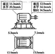 撫順石化公司石油二廠循環(huán)水場一臺風(fēng)機由功率為160kW、轉(zhuǎn)速為1485r/min的電機驅(qū)動,運行過程中振動異常。電機各測點振動值如圖4所示,振動頻率以工頻為主,并測得水平和垂直方向振動相位差約140°。若電機轉(zhuǎn)子存在動不平衡,電機水平與垂直方向的振動相位差應(yīng)為90°左右,電機存在動不平衡的可能性很小。分析認為,由于軸向振動較大,電機與風(fēng)機存在不對中,再者電機四個地腳振動有一側(cè)振動偏高,在排除其螺栓存在松動的可能后,認為電機地腳剛性不足。經(jīng)加固基礎(chǔ)工業(yè)后,機組運行恢復(fù)正常。