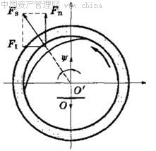 高速離心機轉(zhuǎn)子或其它空心高速轉(zhuǎn)子在內(nèi)壁的局部吸附油或水汽等冷凝后的液體,當轉(zhuǎn)軸旋轉(zhuǎn)時,這種液體會使轉(zhuǎn)子失穩(wěn)。如圖3,當轉(zhuǎn)軸高速轉(zhuǎn)動時,液體沿00′的方向甩向轉(zhuǎn)子內(nèi)壁。但此液體并不是停留在00′的延長線上,而是因粘性被帶至沿長線一側(cè),其重心位于與00′夾角為Ψ的直線上。將液體的離心力Fs分解為Ft和Fn兩個分力,因Ft與O0′垂直,故使轉(zhuǎn)子發(fā)生失穩(wěn)而產(chǎn)生振動,其產(chǎn)生的頻率一般為轉(zhuǎn)速頻率。