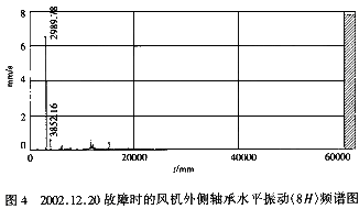 2.對照故障前后風(fēng)機(jī)外側(cè)軸承水平振動頻譜圖3和圖4,可以看出圖中有兩個較大的峰值,其特征頻率分別為3853r/min和2989r/min。前者為風(fēng)機(jī)轉(zhuǎn)速,后者為電機(jī)轉(zhuǎn)速。正常時(圖3),風(fēng)機(jī)的振動水平大于電機(jī)。而故障時(圖4),電機(jī)振動水平不但遠(yuǎn)遠(yuǎn)大于正常時的水平,而且也遠(yuǎn)遠(yuǎn)大于風(fēng)機(jī)水平。因此初步判斷振動原因在電動機(jī)及低速齒輪軸部分。
