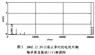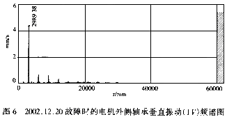 3.再對照故障前后其他測點(diǎn)的頻譜特征,發(fā)現(xiàn)都存在這樣一個現(xiàn)象,即都像風(fēng)機(jī)外側(cè)軸承水平振動那樣有一個電機(jī)轉(zhuǎn)速一倍頻的突增,進(jìn)一步說明振動原因在電動機(jī)及低速齒輪軸部分(限于篇幅,僅選示電機(jī)外側(cè)軸承垂直振動1V故障前后頻譜圖5、圖6)。